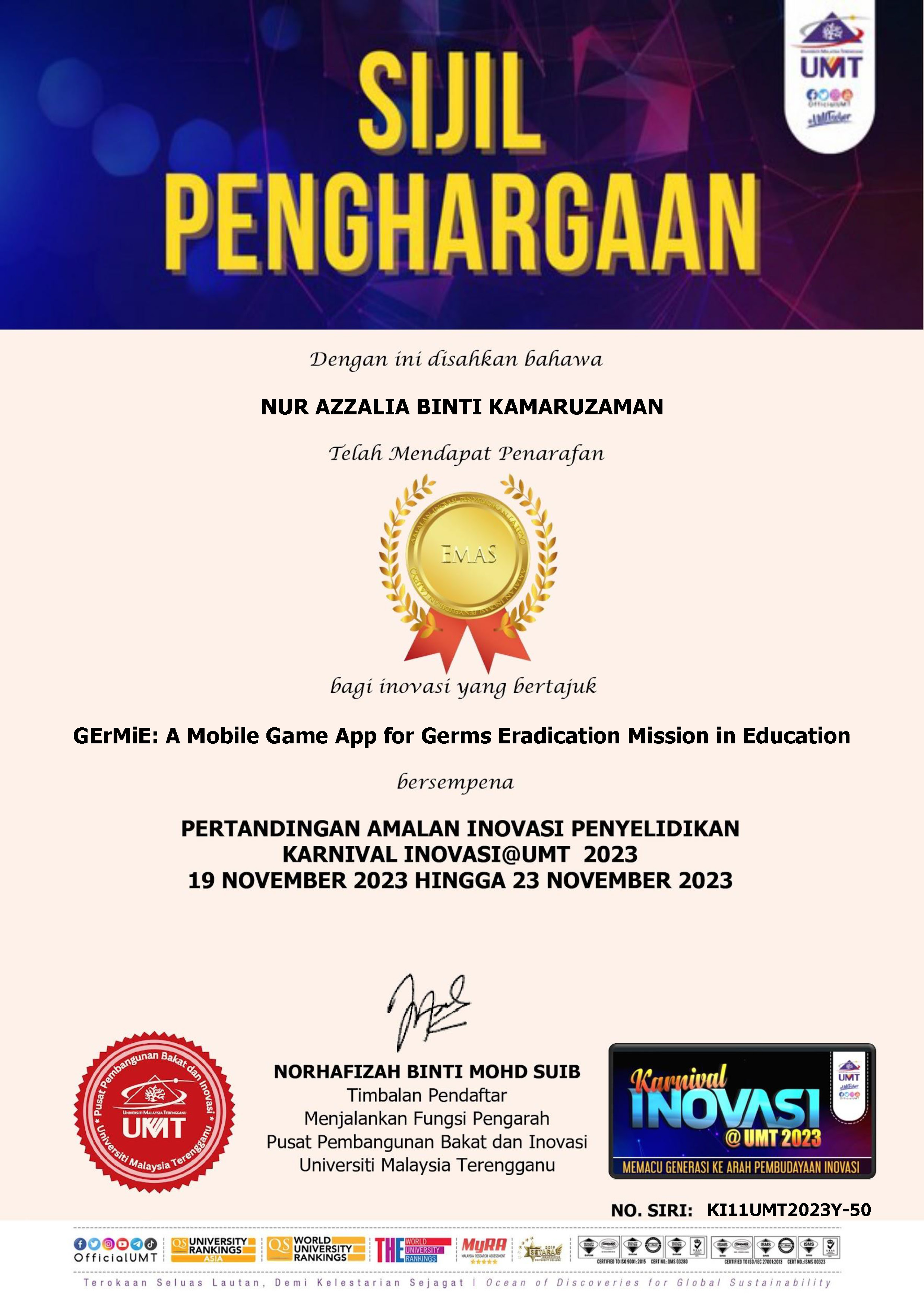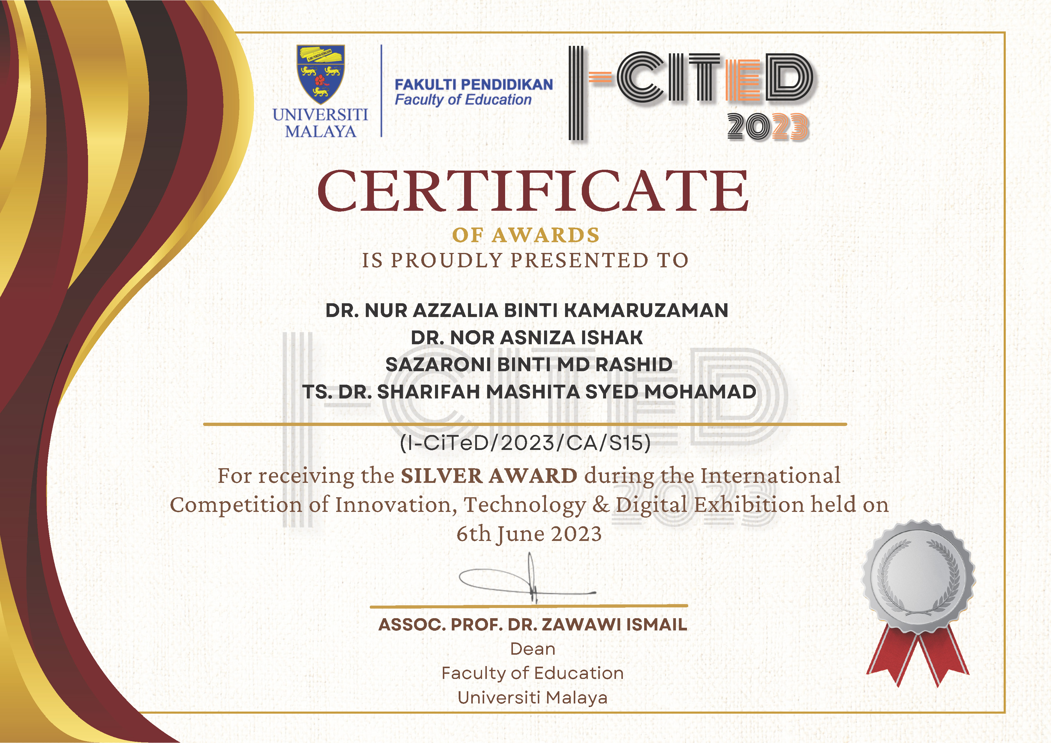 - Silver Awards at the Malaysia Technology Expo (MTE) 2023, I-CITED, and INNOZILLA USM 2024